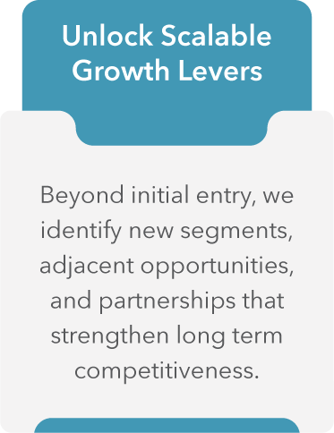 From defining where to play and how to win, to selecting entry modes and building execution-ready roadmaps, we deliver tailored, scalable strategies for every growth journey.